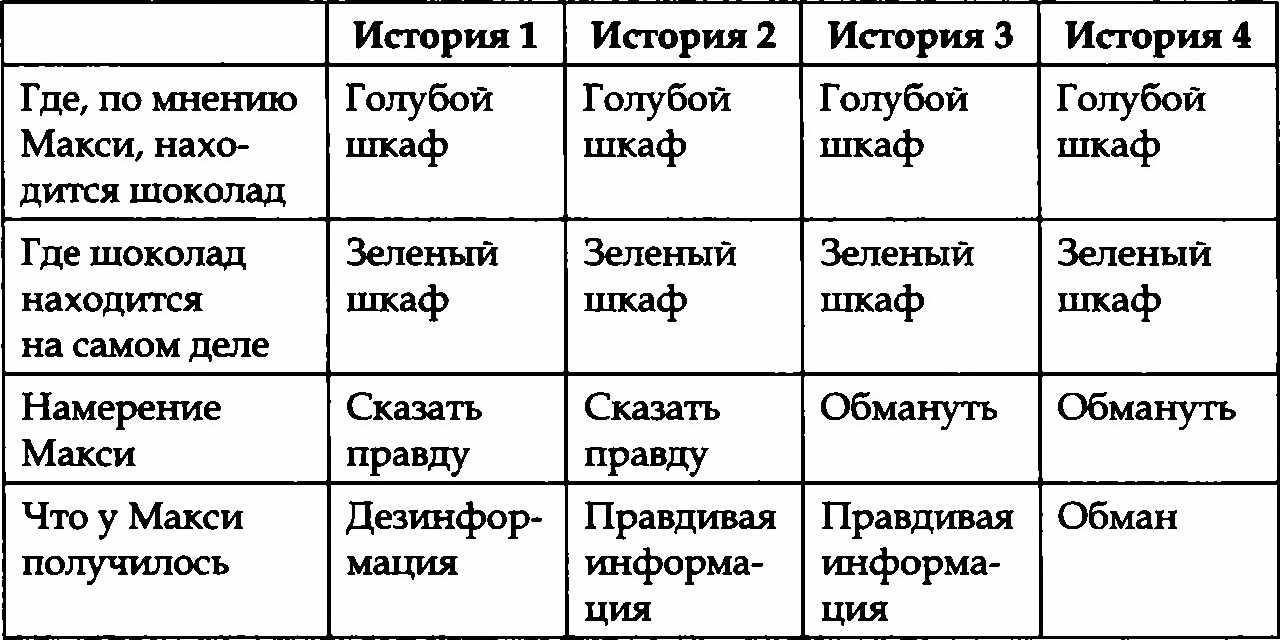 Детям прочитали вслух четыре варианта окончания этой истории. В одной версии Макси хочет сказать правду, но вводит сестру в заблуждение (говорит, что шоколад в голубом шкафу), потому что не знает о том, что мама переложила шоколад в другое место. Во второй версии не говорится о том, что мама переложила шоколад из голубого шкафа в зеленый, поэтому, когда Макси хочет сказать правду, он дает правильную информацию. В оставшихся двух вариантах детям сообщают, что Макси хочет обмануть свою сестру. К истории добавляют вот такие фразы: «Вот еще, — думает Макси, — сейчас сестра съест весь мой шоколад. Но я оставлю его для себя. Я ей нарочно отвечу неправильно, чтобы она его не нашла». Если не менять историю о том, что мама переложила шоколад из голубого шкафа в зеленый, то возникнет ситуация, в которой Макси хотел обмануть, но нечаянно сказал правду. А если убрать часть рассказа о том, что мама положила шоколад в зеленый шкаф, получится, что Макси хочет обмануть и нарочно говорит неправду о том, где сейчас шоколад. Вот таблица с результатами этого эксперимента.
