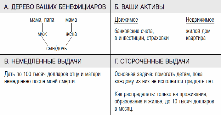 Разделите лист формата A4 на четыре квадрата, как показано на следующей странице. Он уже заполнен на примере Адама (ему 45 лет) и его семьи: жены Бетти (ей 40 лет) и двух детей десяти и двенадцати лет.