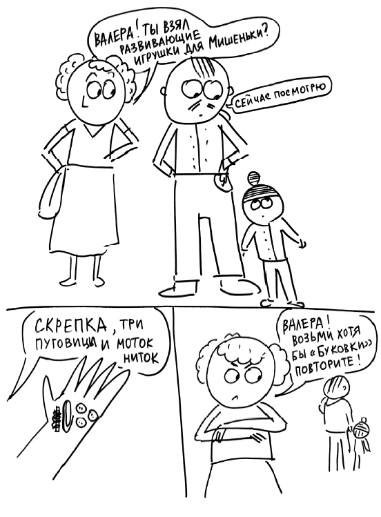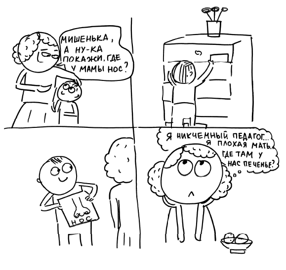 Через чувственный опыт, опираясь на зрение и осязание, он должен находить сходства и отличия. «У мамы тоже есть нос. Но он больше, чем у меня. А папин нос больше, чем у мамы. А еще у папы есть уши. Если сильно потянуть папу за уши, папа закричит, что ему больно. А если закрыть свои уши руками, что-то случится с маминым голосом» — вот это и есть познание мира, вот это и имеет отношение к развитию, это бесценный опыт, и притом бесплатный.