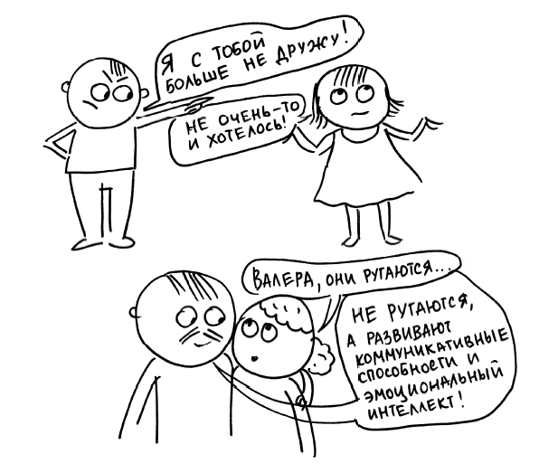 — Как ты можешь это выдерживать? Это же такой шум весь вечер! — удивляется мама Сони, пришедшая к нам за дочкой. Мы с ней уже полчаса пьем чай на кухне. За это время Саня с Соней пять раз поссорились и помирились. В момент кульминации конфликта то Саня кричит: «Я тебя больше в гости не позову!», то Соня: «Я тогда сейчас домой уйду и больше не приду!» Но потом кто-то кому-то уступает, и игра продолжается. Или никто никому не уступает. Какое-то время они молча дуются друг на друга. Потом начинает работать известный феномен «Вместе тесно, а врозь скучно». Дети поскучают и снова играют вместе. От визита к визиту количество споров и ссор между ними уменьшается. Дети — с помощью взрослых — учатся договариваться, делиться игрушками, уступать, не так эмоционально реагировать. Как следствие, они реже обижаются и злятся. К пяти годам они начинают соотносить свое поведение с реакцией другого: «Если я скажу вот это, то Соня обидится. Если поступлю вот так, то Соня рассердится». Это и есть проявление эмоционального интеллекта — способности человека осознавать свои и чужие эмоции, улавливать то, чего хотят другие люди, уметь с ними поладить.