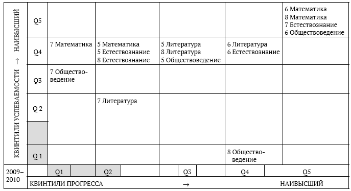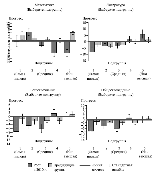 Также интересно отметить, что, даже если уровень успеваемости пятиклассников по литературе и социальным наукам несколько выше, тенденции роста в этих двух предметных областях не лучше, чем в двух других. Так что в этом случае выводы, которые можно сделать по итогам изучения дезагрегированной информации о росте, разительно отличаются от выводов, к которым приводят нас данные об успеваемости.