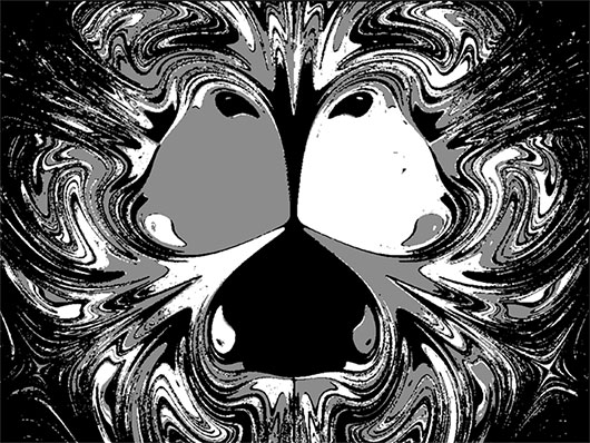 Компьютерные модели могут производить прекрасные визуальные представления, позволяющие составить понятие о чувствительности различных систем к начальным условиям. Рядом с игральной костью из Лас-Вегаса у меня стоит классическая настольная игрушка, в которую я могу играть часами. Она состоит из металлического маятника, который притягивают три магнита, выкрашенные в белый, черный и серый цвет. Анализ динамики этой игрушки дает картинку, которая отражает конечное положение маятника при движении из всех точек квадратного основания игрушки. Покрасим точку белым, если маятник, запущенный из этой точки, в конце концов оказывается притянут к белому магниту. Точно так же покрасим серым или черным точки, из которых маятник попадает на серый или черный магнит. Получится вот такая картинка: