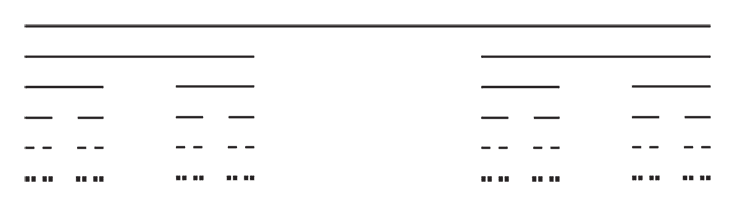 Существует более замысловатый вариант этой картинки. Возьмем снова отрезок единичной длины. Сотрем центральную треть отрезка. У нас остались два черных отрезка, разделенные белым промежутком. Сотрем теперь центральную треть каждого из черных отрезков. Получаем черный отрезок длиной 1/9, белый отрезок длиной 1/9, черный отрезок длиной 1/9, затем белый отрезок длиной 1/3, который был стерт на первом шаге, а потом опять: белый – черный – белый.