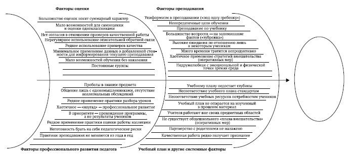 Только после того как команда педагогов сделала все для исследования своих успехов, она может переходить к изучению выявленных проблем. Поиск глубинных причин возникновения тех или иных проблем в точности повторяет описанный выше процесс, единственное отличие в том, что скелет диаграммы строится на факторах, формирующих не сильные, а проблемные стороны работы педагогов. Пример диаграммы Исикавы, посвященной негативным показателям на уровне класса, представлен на рис. 7.3.