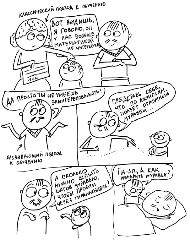При классическом подходе мы даем ребенку в руки линейку и объясняем: «Это линейка. Вот деление — 1 см. Вот так нужно ей пользоваться». Знание ребенок приобретает. Но развивается ли при этом мышление? Развивается ли познавательный интерес?