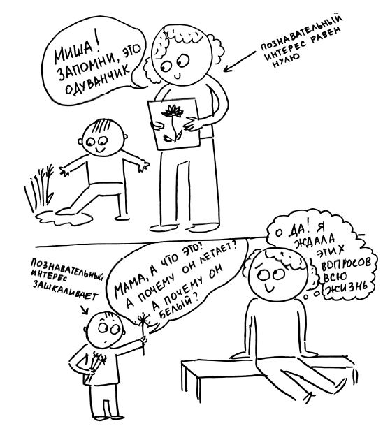 Познавательный интерес развивается не тогда, когда мама показывает ребенку картинку с изображением одуванчика и называет: «Это одуванчик», — а тогда, когда ребенок, движимый любопытством, срывает одуванчик, нюхает его, пробует на вкус и бежит показывать маме.