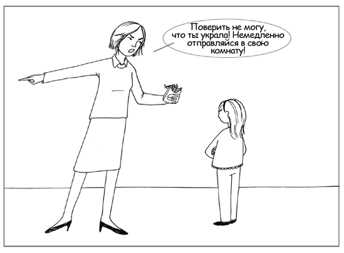 Прежде чем начать беседу, мама присела, опустившись ниже уровня глаз ребенка (как мы советовали в конце предыдущей главы), и лишь тогда ласково заговорила. Сначала шестилетняя девочка отрицала кражу, потом заявила, будто не помнит, что случилось. Но поскольку мама продолжала терпеливо ждать правды, дочь сообщила, что бояться нечего, поскольку она «подождала, когда тетя-продавец с пышной прической отвернется», прежде чем стащить карандаши. Теперь мама стала активно задавать вопросы, заставляющие девочку задуматься о темах, которыми она прежде себя не обременяла. «Ты знаешь, как называется, когда берешь чужое?» «Как ты думаешь, кража – это законно?» «Знала ты, что та дама с пышной прической сначала купила эти карандаши на свои деньги, чтобы положить их на прилавок в своем магазине?»