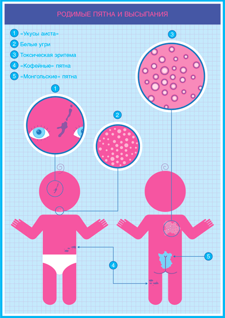 Родимые пятна и высыпания – это изменения пигментации кожи малыша. Они неопасны для здоровья, но научитесь распознавать такие пятнышки, чтобы позже не спутать их с синяками или сыпью. Одни пятна проходят через несколько недель, другие остаются на годы. Если вас беспокоит появление какого-либо высыпания или пятна на коже малыша, обратитесь к поставщику медицинских услуг. Наиболее часто появляются: