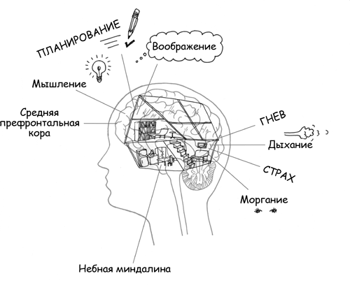 Мозг ребенка можно сравнить со строящимся домом. Его нижний этаж – стволовая часть и лимбическая система – в совокупности образуют нижние отделы головного мозга, так называемый древний, или примитивный, мозг. Эти отделы располагаются у каждого из нас в черепе примерно от уровня переносицы вниз до начала шеи, причем ствол мозга хорошо развит уже на момент рождения. Низший мозг относительно примитивен, поскольку отвечает за чисто биологическое функционирование организма: сильные простые эмоции, инстинкты, в том числе инстинкт защиты потомства, и базовые функции, например дыхание, регуляция фаз сна и пищеварение. Именно этот мозг дает одно– или двухлетнему ребенку команду швырнуть в вас игрушку либо укусить, если не удалось добиться своего. Это источник нашего реактивного поведения, девиз низшего мозга: «Готовьсь! Целься! Пли!» – причем «целься» и «пли» зачастую сливаются в одно действие. Именно нижние отделы головного мозга Нины активировались, когда она узнала, что не мама отвезет ее в детский сад.