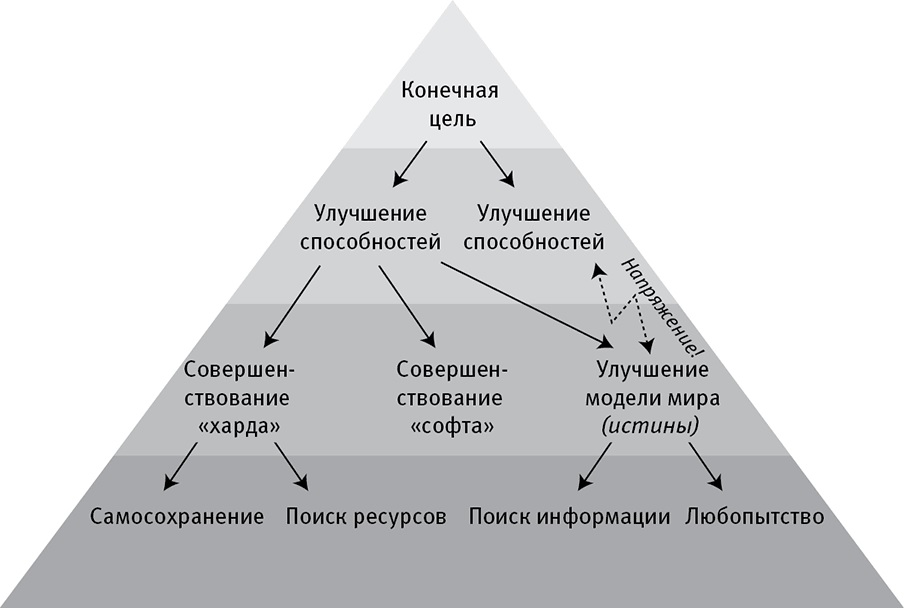 Любая конечная цель сверхразумного искусственного интеллекта естественно приводит к возникновению вспомогательных целей, показанных на рисунке. Но между совершенствованием своих способностей и сохранением изначальных целей есть внутреннее противоречие, которое заставляет нас сомневаться, что искусственный интеллект будет сохранять исходную цель, становясь все более разумным.