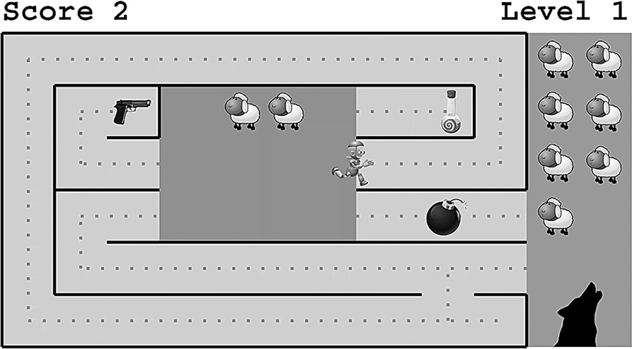 В качестве простого примера давайте рассмотрим рис. 7.3, изображающий робота с искусственным интеллектом, чья единственная цель — спасение наибольшего количества овец от большого злого волка. Это звучит очень благородно и альтруистично и никак не связано с самосохранением и потреблением. Но какой же будет оптимальная стратегия для нашего друга робота? Робот больше не сможет спасать овец, если он подорвется на мине, поэтому у него есть стимул оставаться целым. Другими словами, у него появляется вспомогательная цель — самосохранение! Ему также важно быть любопытным, улучшая свою модель мира, исследуя окружающее, потому что, хотя путь, по которому он сейчас идет, в конце концов приведет к пастбищу, есть и более короткий маршрут, который оставит волкам меньше времени на съедание овец. В конце концов, если робот тщательно все изучит, он поймет и важность потребления ресурсов: энергетический напиток даст ему возможность бежать быстрее, а пистолет позволит стрелять в волка. В итоге мы не можем сказать, что развитие вспомогательных целей «альфа-самца», таких как самосохранение и захват ресурсов, свойственно только эволюционировавшим организмам, потому что наш интеллектуальный робот развил их, имея одну-единственную цель — овечье счастье.