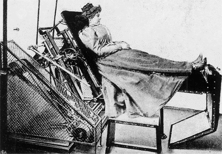 Чтобы успокоить нервы больных, врачи не ограничивались применением электрического тока, иногда они приводили в движение и всю постель. Интересно, что сконструированная примерно в 1900 году врачом Максом Герцем вибрационная, или «трясущаяся», постель (причем второе название, похоже, точнее передавало характер движения постели) должна была подражать тряске движущегося поезда, что оказалось полезным при лечении нарушений сна, общей нервозности и улучшало слух при склерозе среднего уха. Тряска создавалась при помощи упругой деревянной доски, которая прикреплялась к тяжелому каркасу кровати таким образом, что с помощью центрифуги, устанавливаемой на разные режимы, ее «можно было, как скрипичную струну, приводить в колебательное движение». Эта кровать и то, как она функционирует, в свою очередь развивает идею виброкресла, «сумасшедшего» стула, изобретенного известным невропатологом Жан-Мартеном Шарко (1825–1893), который добивался с его помощью хороших результатов в лечении пациентов с болезнью Паркинсона.