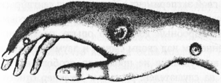Пустулы на руке крестьянки, зараженной коровьей оспой. Рисунок взят из книги Эдварда Дженнера (1798), в которой описывается защитный эффект вакцинации коровьей оспой