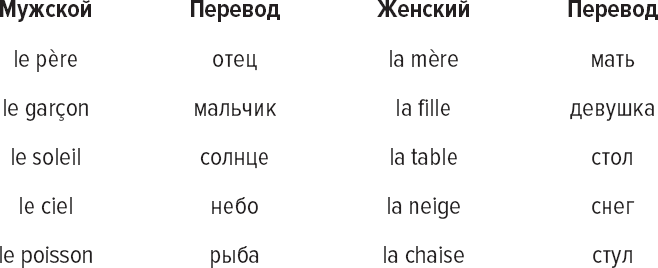 Часто род существительного совпадает с полом объекта, который это существительное обозначает. Например, во французском языке слово отец – мужского рода, а слово мать – женского. Однако, к сожалению, это не всегда так, и рассчитывать на это нельзя. Вообще говоря, в языках, относящихся к одной и той же языковой семье, порожденной латынью, – французском, румынском, итальянском, каталанском, португальском, испанском, – слова часто имеют один и тот же род. Однако есть и множество исключений, поэтому нельзя считать такое совпадение правилом.
