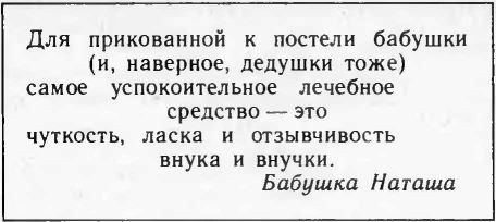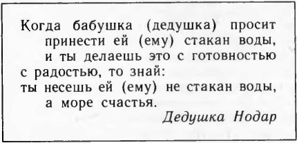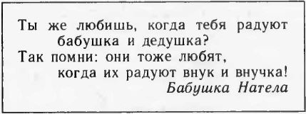 Порой же мы смеялись, ну, конечно, добрым смехом, над вами. А как не будешь смеяться, когда хитрая плутовка-внучка подает бабушке яйцо и просить разбить его, а доверчивая бабушка все сильнее и сильнее бьет его о стол и искренне удивляется, что оно не бьется, внучка же тем временем хохочет до упаду: ведь яйцо деревянное! И эти веселые минуты, дорогие бабушки и дедушки, стоили мне целых дюжин наставлений, как им любить вас: осознав вашу детскую доверчивость, они еще сильнее проникались к вам любовью и уважением...