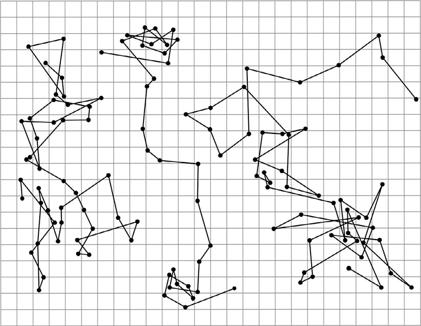 Нужно было предложить какую-то модель, которая воспроизводила бы странное движение частиц пыльцы на поверхности воды. Если наложить на такую поверхность координатную сетку, кажется, что частица пыльцы может с равной вероятностью двигаться влево, вправо, вверх или вниз. Ее движение похоже на перемещения пьяного человека, который совершает случайные шаги, как бы подчиняясь результатам бросков четырехсторонней игральной кости. На приведенной внизу картинке показаны траектории движения разных частиц пыльцы, которые зарисовал французский физик Жан Батист Перрен, взявшийся за решение задачи о движении пыльцы в своей книге «Атомы».