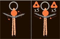 6 Нанижите на каждую руку по пять треугольных бусин.