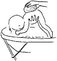 Некоторых детей трудно удерживать на руках, вынимая из ванночки, потому что ребенок выгибается назад (преобладает тонус в мышцах-разгибателях) или потому, что он плохо контролирует положение головы и у него низкий тонус в мышцах туловища, – он как бы выскальзывает из рук. В таком случае, вместо того чтобы класть ребенка в ванночку или вынимать из нее в положении полулежа, лучше сначала помочь ему согнуться так, чтобы тазобедренные суставы были согнуты и бедра приведены к животу, туловище наклонено, плечи и руки выведены вперед (рис. 16.1). Если в первые месяцы вам трудно добиться того, чтобы малыш согнулся, вы можете в качестве временной меры попробовать купать его так, как показано на рисунке 16.2.