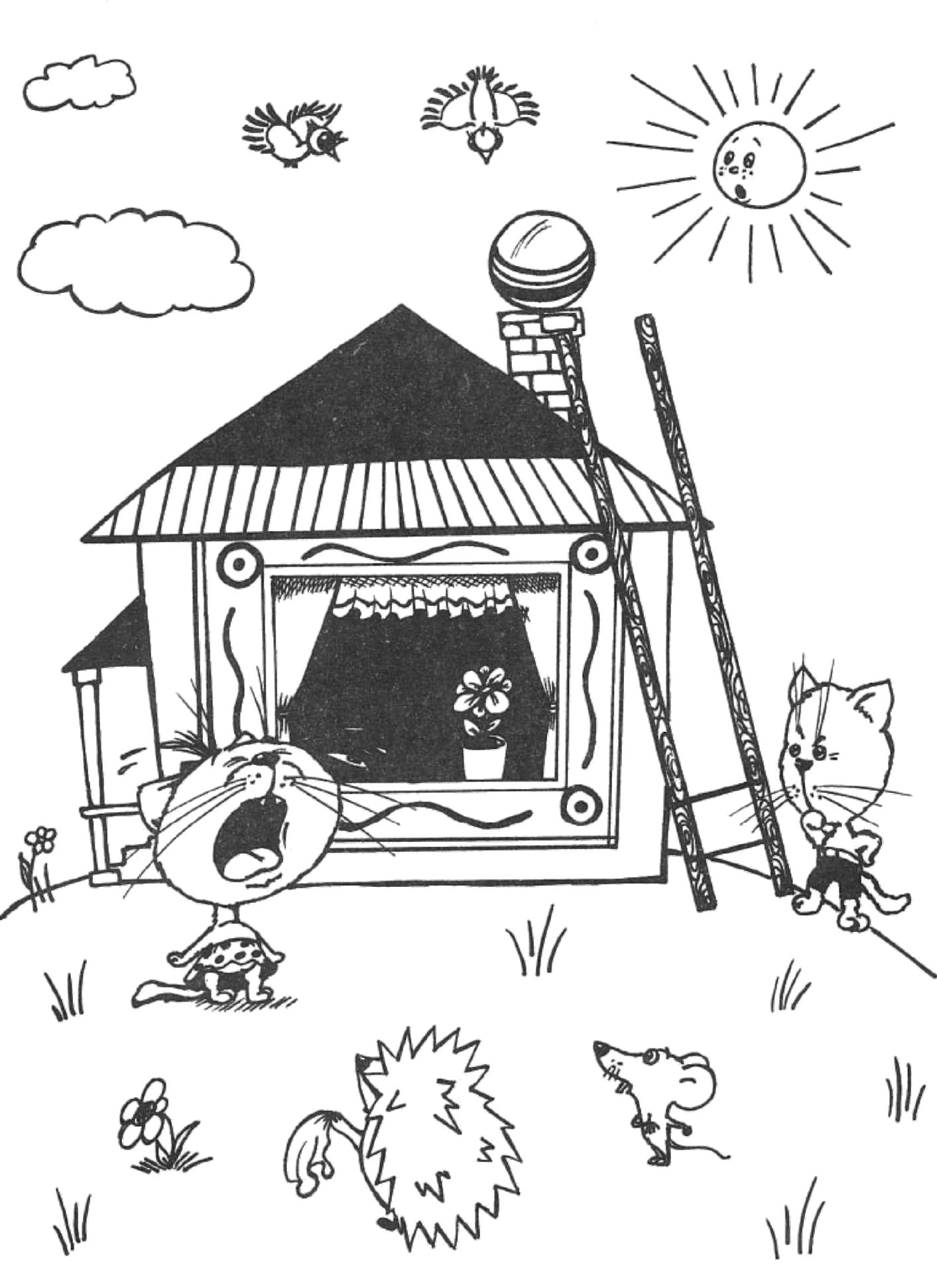 Муся любит играть в мячик. Вот она подкинула его высоко-высоко — мяч лопал на трубу и застрял там! Муся очень расстроилась.