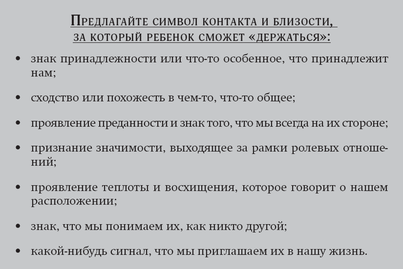 Несмотря на то, что дети рождаются с инстинктом привязанности, взрослые должны взять на себя активную роль в реализации этой способности. Ритуал завладевания – один из основных способов выразить свое желание быть рядом. Мы приглашаем детей в отношения, завладевая их инстинктом привязанности, – мы должны прилагать все усилия, чтобы привлечь их внимание. Участвуя в танце завладевания, мы попадаем в их пространство по-дружески и стараемся добиться их улыбки, контакта глаза в глаза или, возможно, кивка в знак согласия. Например, вы можете сказать: «Вижу, ты строишь башню из кубиков – какая высокая! Я тоже люблю играть в кубики». Когда мы видим, что ребенок готов принимать наше внимание, мы можем продолжить завладевание, добавив штрихи контакта и близости. Если ребенок восприимчив, можно продолжить разговор или предложить ему поделиться своими мыслями: «Какой высоты она будет? Помочь тебе?»