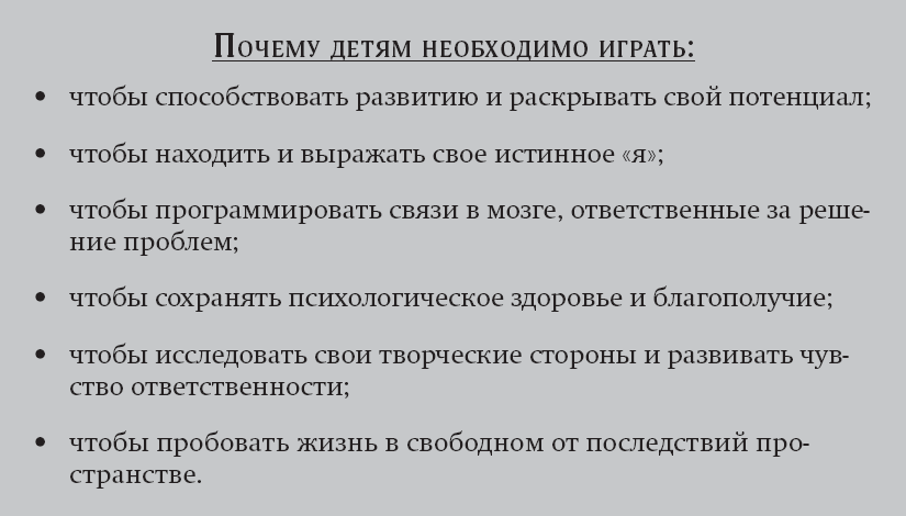 Г. Стэнли Холл, пионер американской психологии, написавший книгу о подростковом возрасте в начале XX века, сказал: «Люди вырастают, потому что перестают играть, но не наоборот».[71] Игра необходима для здоровья человека на протяжении всей жизни, но критична для развития в ранние годы, потому что именно в игре выражается истинное «я», происходит рост и развитие и поддерживается психологическое здоровье и благополучие.