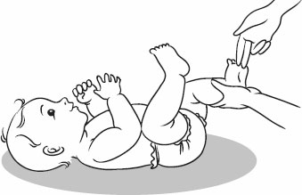 Для выполнения нужно слегка надавливать на основания пальцев со стороны подошвы. В этом случае ступня ребенка будет рефлекторно сгибаться. После этого следует осторожно растереть внешний край ступни, и она сразу распрямится.