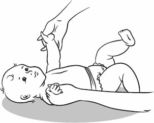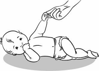 Для выполнения процедуры правой рукой следует поддерживать ноги малыша за нижнюю часть голеней. Вложить в ладонь ребенка указательный палец левой руки, сжать ее в кулачок, а другие пальцы сомкнуть на его запястье. При этом нужно следить, чтобы ноги ребенка были выпрямлены.