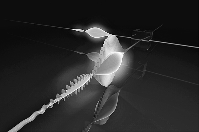 Эйнштейн был способен вообразить себя фотоном [8]. Мы можем примерно представить себе то, что он видел, по этому рисунку — так итальянский физик Марко Беллини представляет себе лазерную вспышку (на переднем плане), которая применяется для определения формы одиночного фотона (на заднем плане).