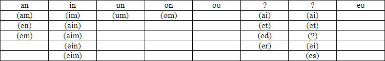 В первое время таблицы не должны включать те сочетания букв, которые заключены в скобки. Научите ребенка петь знакомую ему песенку, показывая пальцем (на таблице) каждую букву или слово. Тогда он сможет найти нужный ему звук, следя за текстом по таблице. Впоследствии, по мере того, как вам встречаются различные написания одних и тех же гласных, вы в присутствии ребенка пишите их на доске в соответствующей колонке. Некоторые звуки могут иметь одинаковое написание. Обратите на это внимание ребенка. Не нужно загромождать стены текстами других песен. Достаточно иметь под рукой семь маленьких табличек со звукобуквенными соответствиями, которые можно показывать в то время, когда вы поете: