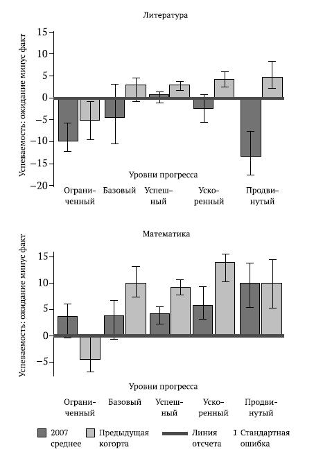 Помните, что темно-серые столбики двух графических представлений соответствуют последним по времени подгруппам пятиклассников школы Тины. В каждом отчете крайний слева темный столбик соответствует тем ученикам ее школы, чей уровень успеваемости попадает в нижние 20 % результатов всего штата. Аналогично крайний справа темный столбик представляет тех учеников школы, чей уровень успеваемости соответствует верхним 20 % результатам учеников всего штата. Остальные три темно-серых столбика показывают учеников, распределившихся по промежуточным квинтилям. Светло-серые столбики каждого графика представляют предыдущие поколения учеников в тех же категориях. Толстая горизонтальная линия на каждом графике соответствует ожидаемому уровню прогресса для каждой подгруппы учеников. Темные и светлые столбики, находящиеся ниже толстой линии, соответствуют подгруппам учеников, которые в среднем продемонстрировали прогресс ниже ожидаемого уровня. Темные и светлые столбики выше толстой линии соответствуют подгруппам учеников, в среднем превысившим ожидания по прогрессу. Во всех случаях чем длиннее столбик, тем более выражено различие между ожидаемым и достигнутым уровнем прогресса.