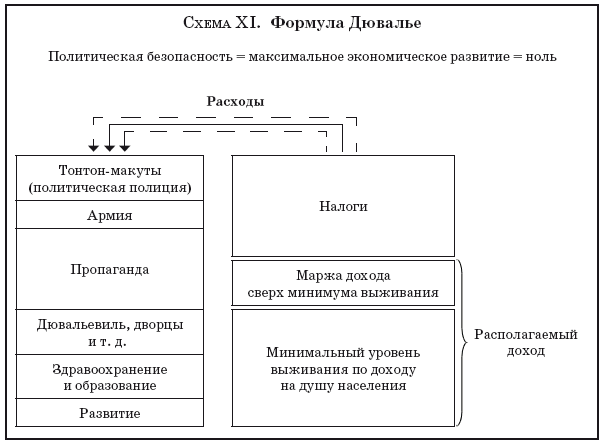 Это формула, которую со все большим упорством применял на Гаити диктатор Дювалье после своего прихода к власти. Налоги, обременительные для страны с годовым доходом на душу населения примерно ?30, тратятся почти полностью на армию, «полицию» (тонтон-макутов) и пропаганду. Единственный проект экономического развития, да и то имеющий сомнительную ценность, – строительство Дювальевиля, новой столицы, в любом случае на нынешний момент приостановленное.