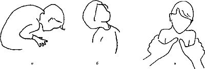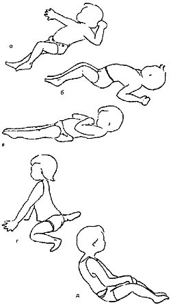 Внимание. Подобные позы характерны для детей с повышенным мышечным тонусом, при гиперкинезах они возникают периодически, а при гемиплегии затрагивают только спастичную сторону тела: а – ребенок повернул голову, она может быть также наклонена в сторону, а в наиболее тяжелых случаях – запрокинута. На той стороне тела, к которой повернута голова, нога и рука разогнуты, ладонь раскрыта; на противоположной стороне нога и рука согнуты, ладонь сжата в кулак. Сильнее всего эта поза выражена, когда малыш лежит на спине или стоит; она изменяется, когда он лежит на животе или сидит; б – голова и руки запрокинуты, спина выгнута дугой. При гиперкинезах ноги согнуты, при повышенном мышечном тонусе – разогнуты и напряжены. Здесь показан ребенок с резким повышением мышечного тонуса, в этом случае данная поза сохраняется даже в положении лежа на животе; в – голова наклонена вперед, руки согнуты и прижаты к груди, бедра и голени напряжены. Если такая поза появляется в положении лежа на спине, в положении лежа на животе она усугубится; г – ребенок поднял и запрокинул голову. Руки разогнуты и напряжены, ноги согнуты в тазобедренных, коленных и голеностопных суставах. Иногда ребенок садится между ногами так, как показано на рисунке; д – ребенок опустил голову – эффект, обратный описанному выше: руки согнулись, а ноги в тазобедренных и коленных суставах разогнулись. То же может произойти, когда ребенок сидит.