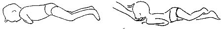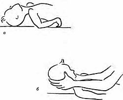 Рис. 6.10. а – ребенок с резко повышенным мышечным тонусом лежит на животе. Его надо научить поднимать голову и, выдвигая плечи вперед, опираться на согнутые руки. Ему будет легче сделать это, если вы положите его на клин; б – перекладывая ребенка на клин, не надо сначала поднимать его голову, а потом пытаться вывести вперед его руки, поскольку так он будет еще сильнее их сгибать и прижимать к себе, а также сгибать ноги в тазобедренных суставах и разгибать в коленных.