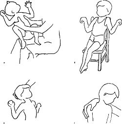 По сопротивлению пассивным и активным движениям можно судить о степени повышения мышечного тонуса. Например, усаживая ребенка, вы выводите вперед его руки. Вы ощущаете сопротивление, и по его силе можете понять, насколько трудно малышу выводить руки вперед и в его ли силах сделать это самому, другими словами, на какое участие с его стороны вы можете рассчитывать и в какой мере он способен выполнить это движение самостоятельно.