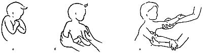 Рис. 6.7. а – положение руки у ребенка с гемиплегией. Рука согнута и развернута внутрь в плечевом суставе (плечо опущено). Предплечье пронировано (повернуто так, что ладонь смотрит вниз), запястье согнуто, большой палец прижат к ладони, пальцы сжаты в кулак; б – неправильный прием разгибания запястья и пальцев. Если так нажимать на большой палец, сгибание запястья и пальцев только усилится, а суставы большого пальца можно даже повредить; в – правильный прием, позволяющий разогнуть руку, запястье и пальцы. Развернуть плечо наружу, разогнуть локоть, поворачивая предплечье и ладонь вверх. Тогда запястье и пальцы легче разогнуть и можно свободно отвести большой палец от ладони; г – поднимая руку и поворачивая ее наружу, вы снизите тонус сгибателей, не позволите руке и плечу опуститься. Рука повернута наружу и разогнута в локте и запястье. Отводя большой палец, вы облегчаете разгибание остальных пальцев; д – таким образом надо держать руку ребенка, когда вы учите его опираться на ладонь выпрямленной руки.