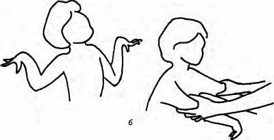 Рис. 6.6. а – дети с меняющимся тонусом и непроизвольными движениями (гиперкинетическая форма церебрального паралича) часто держат голову и руки в положении сидя так, как показано на рисунке. Руки согнуты, плечи приподняты и повернуты наружу. Ноги могут быть согнуты и развернуты в тазобедренных суставах наружу, либо разогнуты и развернуты в тазобедренных суставах внутрь; б – одним движением разверните плечи ребенка внутрь и опустите, разгибая руки и притягивая его к себе. Этот прием помогает ребенку наклонить голову вперед, выпрямить спину и согнуть тазобедренные суставы.