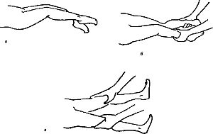 Рис. 6.8. а – типичное положение ног при резко повышенном мышечном тонусе в положении лежа на спине. Ноги разогнуты в тазобедренных и коленных суставах; б – неправильный способ развести ноги ребенка; внутренняя ротация (поворот внутрь) и приведение ног усугубляется; в – разведите ноги ребенка и разверните их наружу, удерживая бедра над коленным суставом. Наружная ротация прямых ног облегчит их разведение и тыльное сгибание стоп.