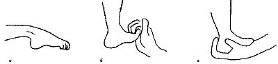 Рис. 6.9. Если стопа находится в положении резкого подошвенного сгибания (а), не разгибайте ее (не приводите в положение тыльного сгибания), надавливая на возвышение под пальцами (б), вместо этого одной рукой удерживайте колено согнутым, а другой захватите стопу с пяткой, держа ее ровно по средней линии, и медленно, как можно сильнее, сгибайте стопу по направлению вверх.