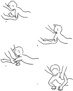 При занятиях с ребенком (особенно с маленьким) с церебральным параличом очень важно правильно воздействовать на него руками. Используемые приемы должны быть эффективными и в то же время экономичными, то есть не чрезмерными по силе воздействия, ваши руки должны очень чутко ощущать малейшие изменения мышечного тонуса ребенка.