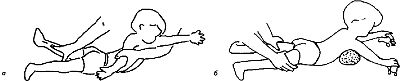 Рис. 6.12. а – прежде чем положить ребенка на валик, его тело лучше выпрямить. Чтобы ему было легче сохранять тело выпрямленным, положите его руки так, как показано на рисунке, выпрямите ноги и поверните бедра наружу; б – ребенок лежит на валике. Если он уверенно контролирует положение рук, вы можете помочь ему разгибать туловище и шею. Возьмите ребенка за таз с двух сторон и осторожно, но сильно потяните на себя – так вы дадите ему большую стабильность, обеспечите точку фиксации.