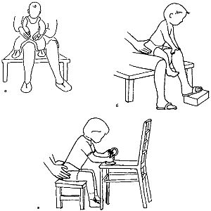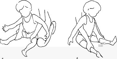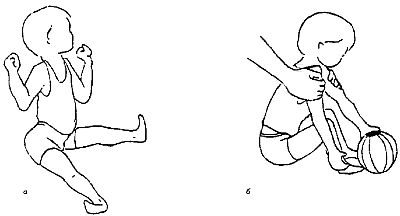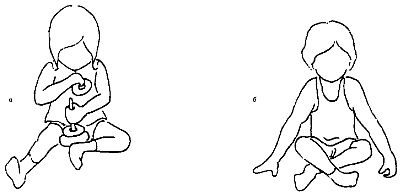 Рис. 6.16. а – гиперкинетическая форма церебрального паралича. Площадь опоры большая, поэтому ребенок может сидеть с прямыми ногами. Однако часто чрезмерное сгибание в тазобедренных суставах компенсируется разгибанием шеи и туловища, отведением рук назад (ретракцией). В результате ребенок не может свободно двигаться в положении сидя, опираться на руки или наклоняться вперед, чтобы ими действовать; б – ребенок сидит с согнутыми ногами, которые приведены друг к другу, руки – перед собой. Его крепко удерживают за плечи, выводя их вперед. В этой позе ребенка можно учить держаться руками, например, за мяч. Он сможет сохранять эту позу сам, если обхватит руками согнутые в коленях ноги.