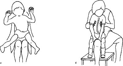 Рис. 6.14. а – площадь опоры слишком большая. Бедра и голени разогнуты и повернуты внутрь, ребенок откидывается назад. В результате нарушена поза в целом, хотя спастичность сильнее выражена в руках, чем в ногах; б – площадь опоры меньше. Бедра развернуты наружу, ноги согнуты в тазобедренных и коленных суставах. Ребенку слегка надавливают на грудь, поднимая и поворачивая внутрь плечи, таким образом контролируя положение головы и рук. Благодаря тому что плечи и руки повернуты внутрь, ребенок не может отвести руки назад и развернуть их наружу. Надо поощрять ребенка опираться на прямые руки.