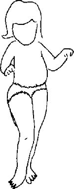 Рис. 6.18. Типичная поза, в которой стоит ребенок с умеренно повышенным мышечным тонусом. Ноги согнуты в тазобедренных и коленных суставах, поясница уплощена (сглажен естественный поясничный лордоз), таз наклонен назад. Площадь опоры маленькая, нагрузка приходится на внутренний край стопы, и невозможно ни опираться на обе ноги равномерно, ни перенести вес на одну ногу, чтобы сделать шаг.