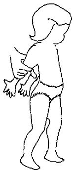 Рис. 6.19. Один из приемов, который помогает ребенку правильно стоять: бедра и туловище разогнуты, вес распределен равномерно, можно перенести вес с одной ноги на другую. Руки выпрямлены и отведены назад по диагонали, то есть руки поворачивают наружу в плечевых суставах и смещают вверх и вперед. Надо обратить особое внимание на то, что вес ребенка должен быть перемещен вперед и распределен по всей площади опоры.