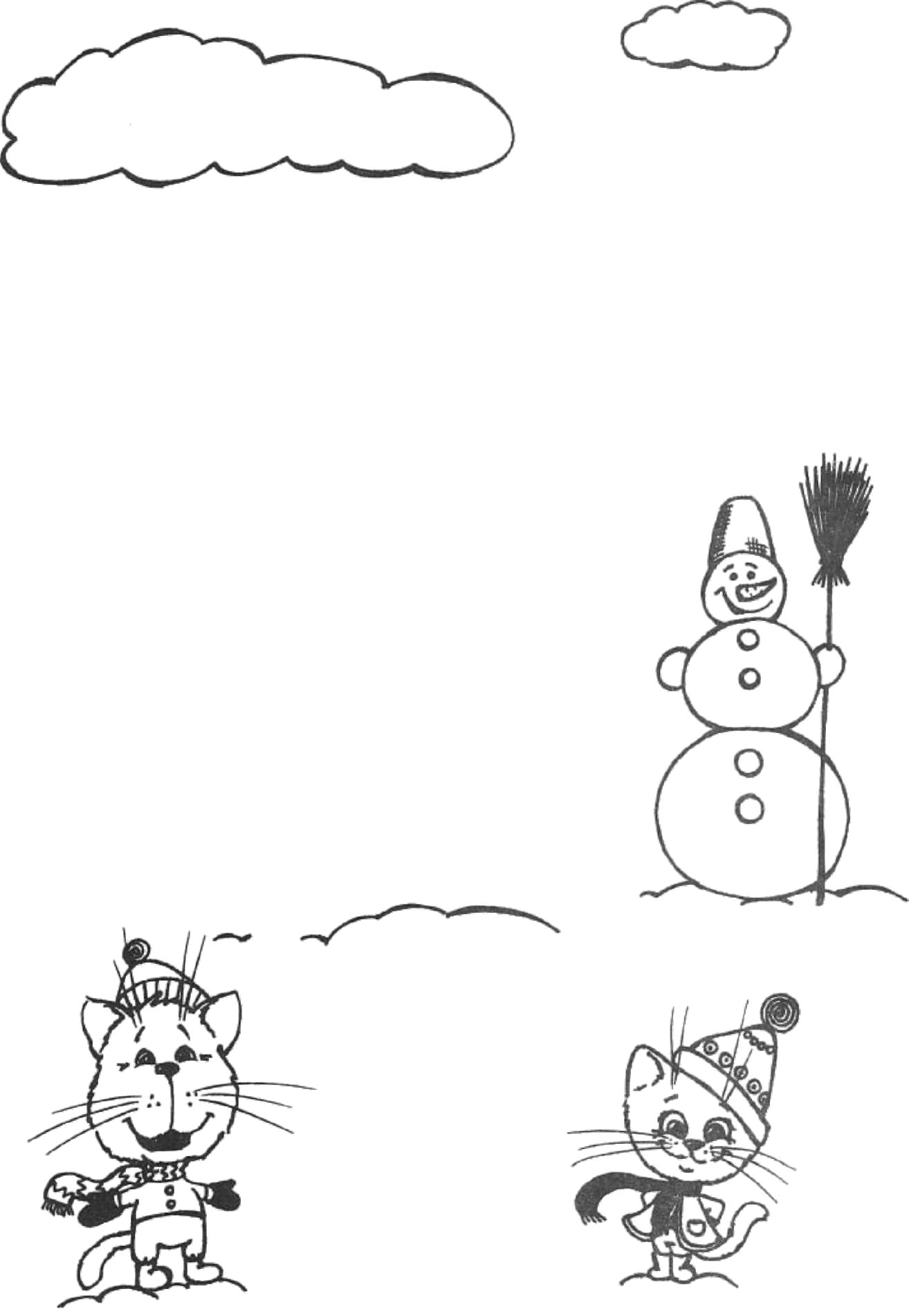 Давай нарисуем, как падает снег. Пусть его будет много-много, чтобы котята смогли слепить снеговика (рисуем падающий снег точками или маленькими кружками сверху вниз).