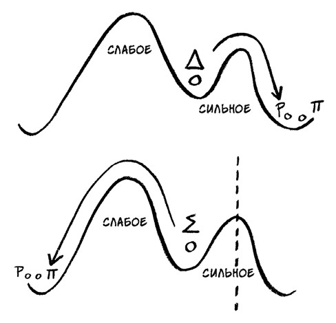 Представим себе шар, лежащий в ложбине. Если слегка подтолкнуть шар вправо, он перекатится через бугорок и попадет в более глубокую ложбину. Этот путь соответствует сильному ядерному взаимодействию. Слева от шара расположен более высокий бугорок, за которым также лежит состояние с более низкой энергией. Это направление соответствует действию слабого ядерного взаимодействия.