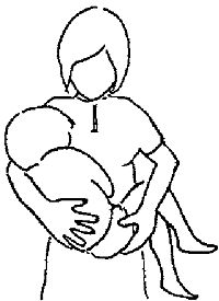 На рис. 19.10 показано, как можно носить ребенка дома – он лежит на боку, а вы прижимаете его к себе. В этом положении вы удерживаете спину малыша прямой, не даете ему опустить руки вниз и согнуть их. Одновременно вы держите его ноги разогнутыми, разведенными и повернутыми наружу; к тому же, вы можете слегка поворачивать плечевой пояс относительно тазового.