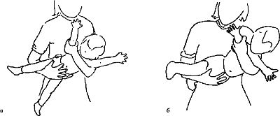Рис. 19.10. а – хороший способ носить ребенка дома. Нужно положить его на бок и прижать спиной к себе; б – ротация туловища (мама поворачивает плечевой пояс относительно тазового).