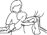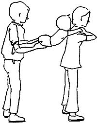 На рис. 19.12 показано, как можно вдвоем носить ребенка постарше, который уже вырос и стал тяжелым, и при этом тренировать его. Ноги ребенка выпрямлены, бедра повернуты наружу, стопы упираются в туловище одного из взрослых. Удерживая его таз снизу ладонями и упираясь большими пальцами рук в ягодицы, взрослый пытается разогнуть ноги малыша в тазобедренных суставах. Если мышцы расслабятся и это удастся, можно попросить его приподнять голову и выпрямить спину. Если же это сделать не удастся, а малыш сводит ноги и ротирует их внутрь, держать его таким способом не следует.