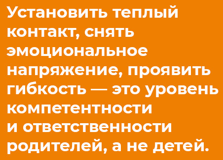Родители несут ответственность и за отношения с детьми. Абсолютно недопустимо и безответственно обижаться на ребенка, игнорировать его, в качестве наказания не разговаривать с ним по две недели. Бывает, родители развелись, живут отдельно, и отец жалуется, что сын не идет с ним на контакт: на звонки не отвечает, при личном общении двух слов из него не вытянешь. Отец обижен: «Подрастет, поумнеет, тогда и поговорим, алименты я перевожу, пусть мать его сама воспитывает». Но если мы хотим, чтобы ребенок ощущал нашу любовь, мы должны не самоустраняться, не уходить в тень, дожидаясь, пока он первым сделает шаг навстречу, а выстраивать отношения, понимая, что даже шестнадцатилетний подросток не способен самостоятельно решить коммуникативные задачи такого уровня. Проявить гибкость, снять напряжение и установить теплый контакт – это уровень компетенции и ответственности родителей, а не детей.